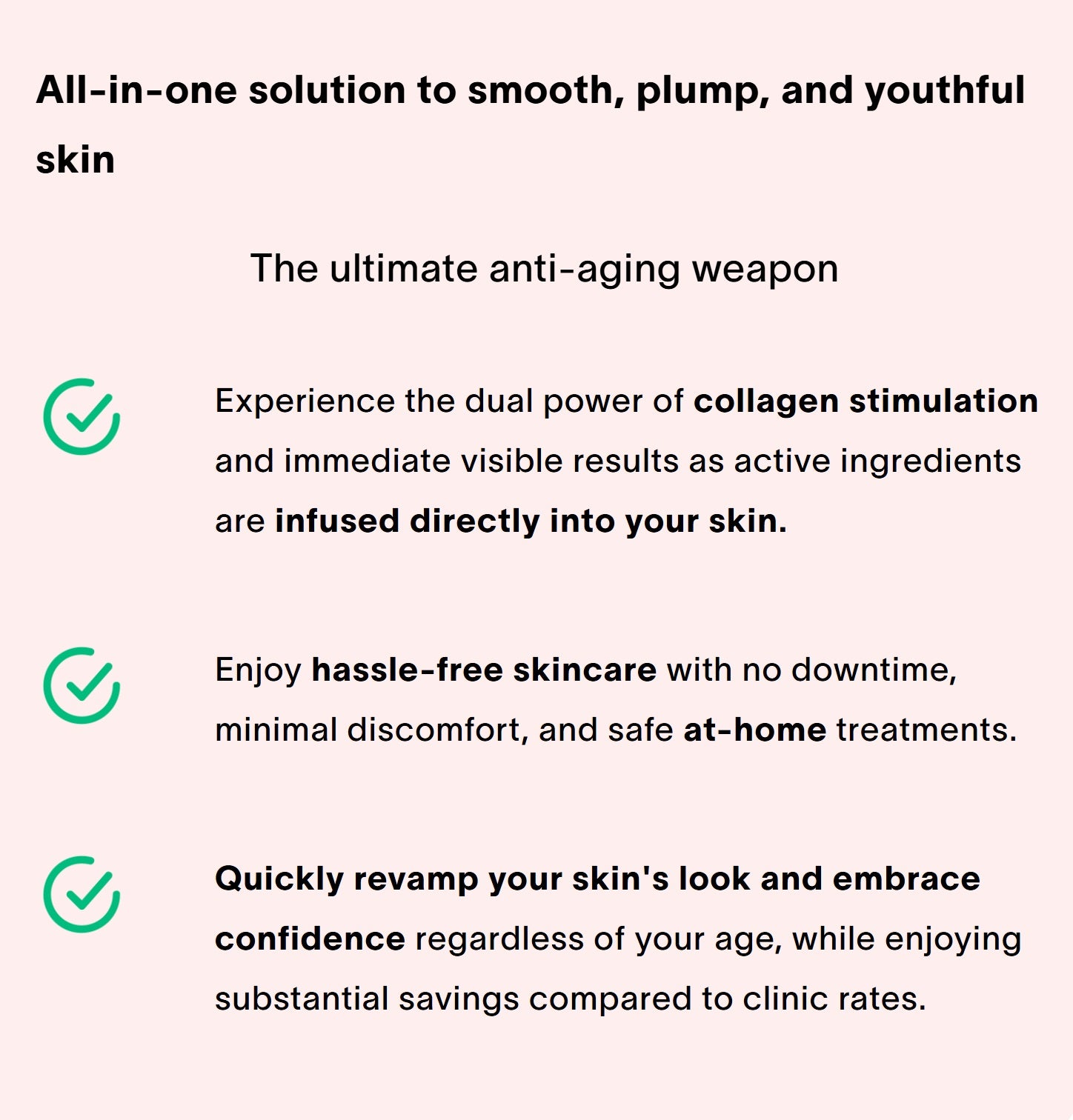 First, it delicately "stamps" the skin with 24K gold 0.25mm clinical-grade needles, inducing controlled trauma. This prompts increased collagen production, naturally improving elasticity and diminishing fine lines and wrinkles.